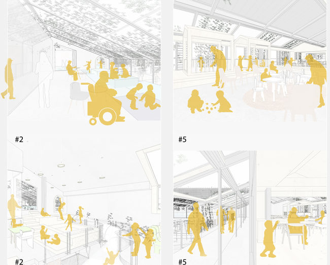 Followed by the first strategy of creating new shared-retail typology or social commerce space is to draw crowds of young generation to re-visit proposed site. Age-integrated facilities will be the next focus to encourage those young generation to re-engage with existing aging society. A senior center and kids day-care center are intentionally located in the center, so that young and old get to interact before or after they bought groceries. Tea houses are proposed in the center for all generations to enjoy tea talk session and perhaps join a “book club sharing day”. Kids from day-care center will be scheduled to make crafts with the elderly. Elderly could also tell stories to the kids. The elderly surely enjoy seeing kids being active and happy. In fact, kids are the most powerful ones that could make elderly forget about loneliness, boredom, etc. Koteon, a multi-generational facility has proven an answer to the urgent problems surrounding aging in Japan through introducing social program for preschoolers and elderly home residents. Overall, the age-integrated facilities are further developed with cross-mall route concept to target the great population of working adults, 300m radius away from the proposed site.